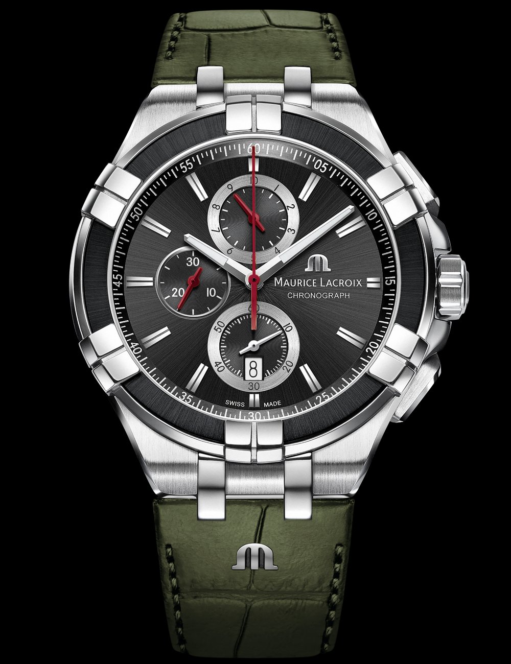 black with raised horizontal grooves on the Aikon Quartz Three-hands and sunray-brushed black on the Aikon Quartz Chrono. Both feature hour -markers, date aperture (at 3 o’clock for the threehanded version, at 6 o’clock for the chronograph) and satin-finish steel chronograph counters that add to the contrast and mirror the case and rhodium-plated hands. This harmony of style and colour is complemented by a militar y green calfskin strap with tone-on-tone stitching, equipped