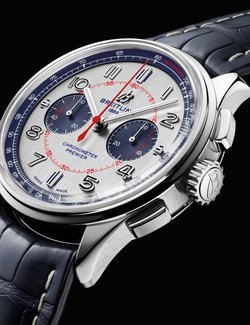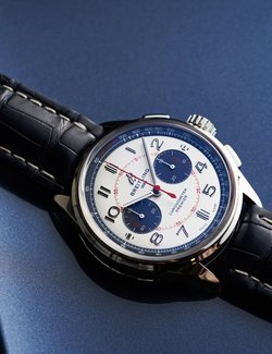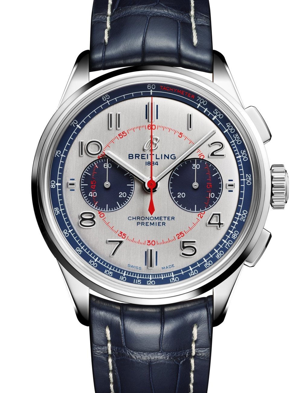 For nearly 150 years, Mulliner has been renowned for its exquisite bespoke handcrafted coaches, created to the highest standards to meet the exacting requirements of its clients. The new Premier Bentley chronograph has some close links to the interior of the most luxurious GT ever designed by Mulliner, and particularly to the Breitling clock in the luxury automobile’s dashboard. Presented on a blue alligator leather strap, and featuring blue & red accents, the watch echoes the interior of the car. Also, the vertically brushed silver dial of the Premier recalls the car’s Breitling dashboard clock, and complements it’s sets of Arabic numerals: 3, 6, 9, 12 for the dashboard clock and 1, 2, 4, 5, 7, 8, 10, 11 for the chronograph. Sharing these numerals across the two pieces is a nod to their common design DNA. On the left side of the case is a plate with an engraved “Bentley” inscription, whose design is based on the engine spin dashboard found in historic Bentleys. The Premier Bentley Mulliner comes in a limited edition of 1.000 pieces, each of which engraved “ONE OF 1.000”.