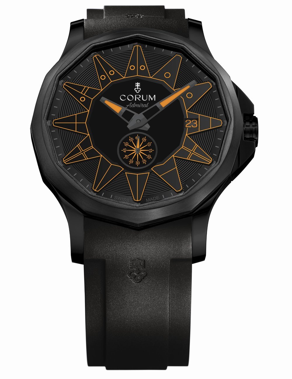 The latest Admiral 42 Automatic Full Black is the complete opposite of its colorful predecessors, and a first-ever within the Admiral family of watches. It features the iconic dodecagonal case in black PVD-treated stainless steel, paired with a blackened brass dial. The nautical pennants, minute markers presented in greyscale tones to balance the austerity of the all-black design, while markers for the minute and small seconds are made visible using a tone-on-tone effect. For this spring season, Corum introduces colorful and flashy hour’s markers flags, in blue, red, yellow, green and orange.