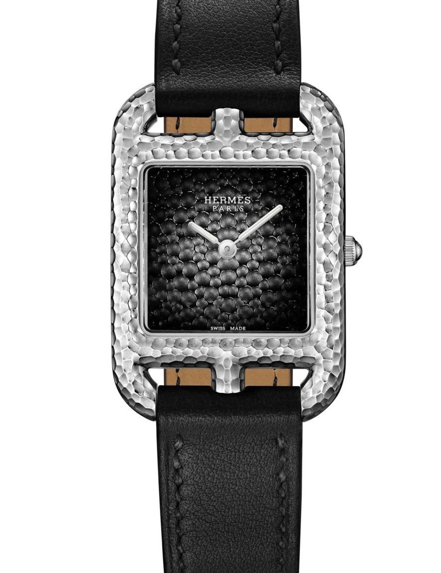 Today, this everevolving classic lends its finely balanced shapes to the excellent jewellers skill known as hammering. This complex and sophisticated technique enhances the steel case with a unique patina-type effect. The likewise hammered dial is coated with a thin layer of translucent lacquer, in graded shades ranging from anthracite to black. The raw yet crafted material, with all its depth and roughness, results in an object with an entirely unexpected look. Finally, the Cape Cod Martelée combines its offbeat temperament with an understated black calf strap in single or double tour versions.
