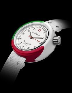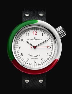 The color of the dial is available in either black or white with Arabic numerals. The hour and minute hands have a luminescent line and the seconds hand is red with an arrow point at the top. The robust case is cylindrical and made of steel and epoxy resins in the colors of the Italian flag. The watch is powered by a self-winding mechanical Swiss automatic movement caliber ETA 2824. The strap of the watch is handcrafted in Tuscany and available in either black or white leather.