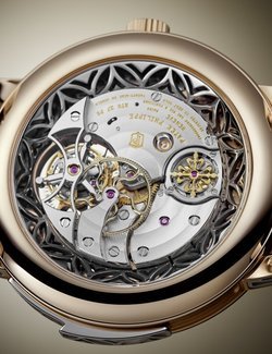 The inimitable rose-gold case sports a wide, cambered and polished bezel as well as white-gold inlays with foliage engravings that grace the caseband and the strap lugs. The white-gold slide in the left-hand case flank that activates the minute repeater features the same motif. The hour circle is black-lacquered sapphire-crystal rim with powdered rose-gold markers. The movement can be admired through the sapphire-crystal case back and is framed by a white-gold rim. Its open-worked decoration echoes the case inlays and the repeater slide.