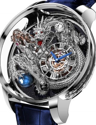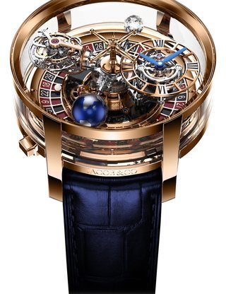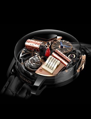 Caliber: Exclusive Manufacture Jacob&Co Manual-Winding JCFM07. Diameter: 44.30mm. Height: 17.09mm. Power Reserve: 44 Hours. Frequency: 21’600 vib/h (3 Hz). 58 Jewels. System: Triple Axis Tourbillon, Music Box with Double Combs.