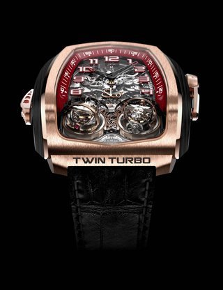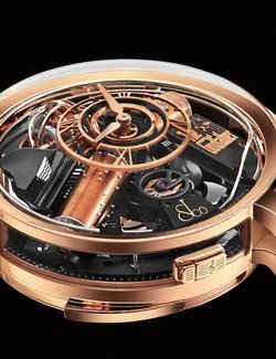 The minute repeater in the Opera Godfather uses two hammers to strike exposed circular gongs to sound out the hours, the quarters of hours, and the minutes. In the Opera Godfather Minute Repeater, the gongs circle above the dial, visible through the large sapphire crystal and rose gold case. This voluminous case enhances the clarity, tone, and richness of the sound of the gongs.
