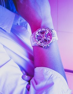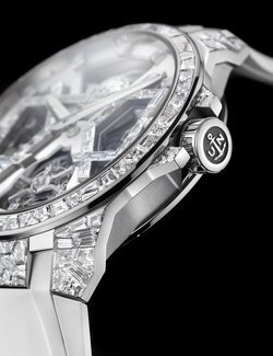 Ulysse Nardin presents its high jewellery timepiece, an open worked automatic tourbillon embellished with what appears to be a mosaic of hundreds of shattered shards of mirror. Made from expertly, geometrically cut diamonds, each faceted stone is sculpted by hand.