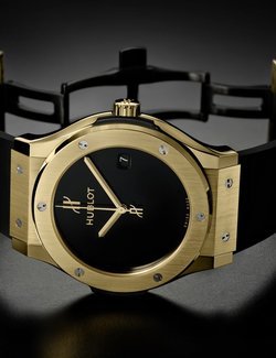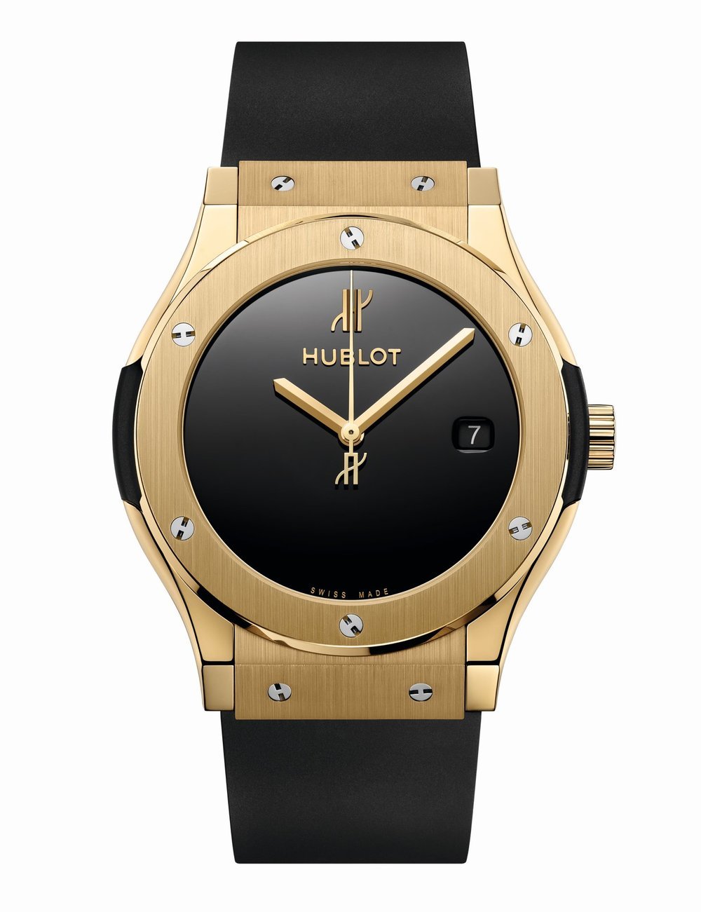 The new Classic Fusion models capture the elegance and timeless refinement of the 1980 Classic Original, as well as four decades of ceaseless exploration and innovation. The black lacquered and polished dial is ultra-understated, featuring only faceted hands, an applique Hublot and H logo. The 45 mm case, made from yellow gold, titanium or black ceramic, includes the famous screws on the bezel and a sapphire crystal case back, and sit on a timeless, easily adjustable rubber strap with a triple deployant clasp for added comfort. These signature details add a contemporary touch to the first Hublot watch, lending these models a beautifully timeless character.