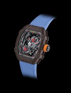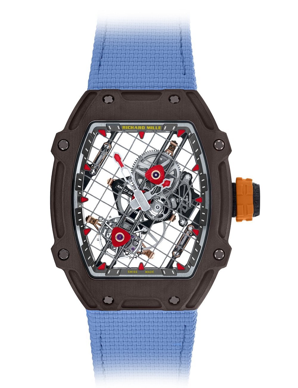 The RM 27-04 balances a lightweight design–at 30 grams including the strap–with tremendous resistance. Its tourbillon calibre, which is suspended within the case, can resist accelerations of more than 12,000 g’s, a record for Richard Mille. The movement is entirely supported by a micro-blasted mesh just 855 square millimetres in surface, comprised of a single cable in braided steel measuring 0.27mm in diameter, and held in place by two tensioners in PVD-treated 5N gold.