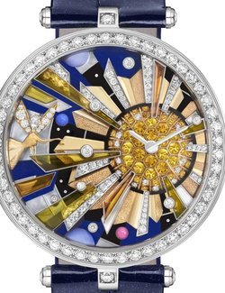 Extraordinary Dials Collection, Lady Arpels Soleil Féerique watch. 41mm white gold case, round diamonds; white gold bezel, round diamonds; foreground yellow gold fairy, rose-cut and round diamonds, white gold sunrays, round diamonds, plique-à-jour enamel, middleground yellow gold sun, variation of round yellow sapphires, round diamonds, yellow gold and white gold sunrays, grey enhanced white mother-of-pearl sunrays, background white gold, lapis lazuli, onyx and grey enhanced white mother-of-pearl sunrays marquetry, enamel beads planets; white gold crown, round diamond; interchangeable strap; white gold interchangeable pin buckle, round diamonds; DEF, IF to VVS diamonds; manual-winding mechanical movement (430P), 40-hour power reserve; numbered and limited edition of 3 pieces; 150mm x 200mm x 118mm cabinet, sycamore wood.