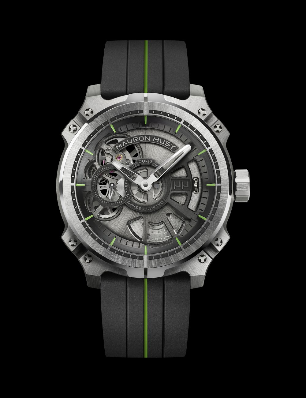 • Central displays of the hours and minutes • Small seconds at 9 o’clock • Luminescent-tipped diamond-polished hands • Dial in 6 parts, machined in full, Black and Ruthenium-plated, green index • Diamond-polished angles • Full 3D laser engraving • Stamped with the serial number on 13