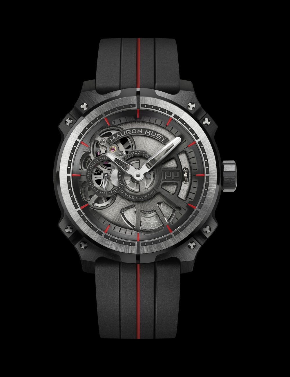Central displays of the hours and minutes • Small seconds at 9 o’clock • Luminescent-tipped diamond-polished hands • Dial in 6 parts, machined in full, Black and Ruthenium-plated, red index • Diamond-polished angles • Full 3D laser engraving • Stamped with the serial number on 13