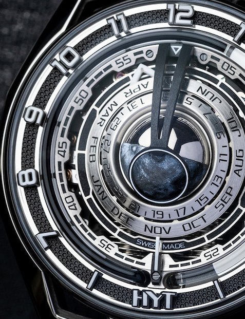 Fluidic retrograde hours - Central minutes hand - Day of the mopn - 3D moon phase - Month