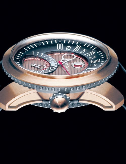 Two-hammer minute repeater complication; jumping hours complication with aperture display at 3 o’clock; retrograde minute complication indicated by Mickey Mouse’s right arm